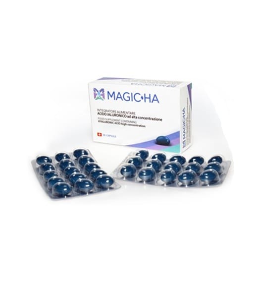 Capsule a base di acido ialuronico concentrato, l’acido ialuronico è un polisaccaride lineare ad alto peso molecolare, ampiamente presente nei tessuti connettivi degli organismi, uomo compreso. Si concentra soprattutto a livello del liquido sinoviale (che bagna le superfici articolari, preservandole dall’usura), della cartilagine, dell’umor vitreo dell’occhio e del cordone ombelicale. L’acido ialuronico è in grado di legare a se molte molecole di acqua, raggiungendo un elevato grado di idratazione. Per questo motivo, date le spiccate proprietà viscosizzanti, l’acido ialuronico è fondamentale per mantenere il giusto grado di idratazione, la turgidità, la plasticità e la viscosità della matrice extracellulare (ECM).